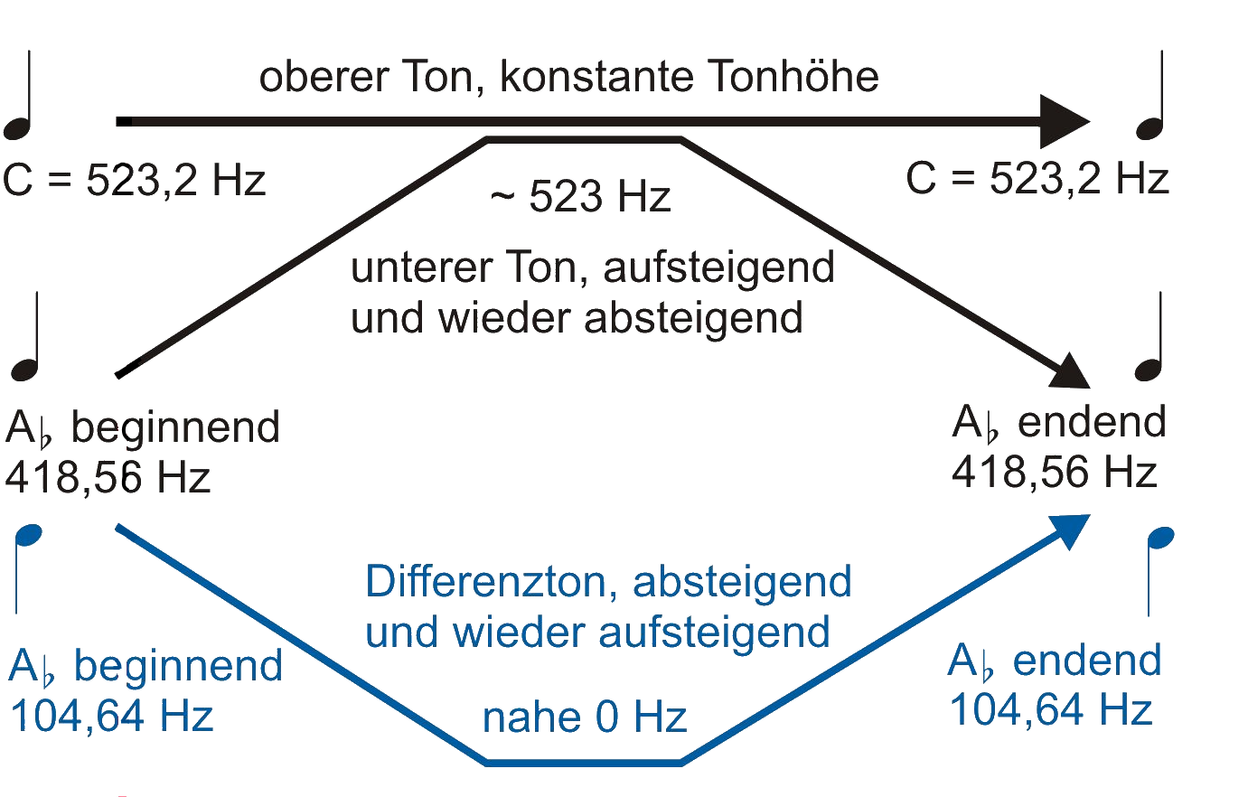 Wir haben schon die Differenztöne erwähnt. Den meisten Musikhörern fallen sie gar nicht auf, obwohl sie bei mehrstimmiger Musik deutlich mitklingen. Differenztöne mit weniger als 18 Hz nehmen wir nicht als Töne, sondern als Schwebungen wahr. (Bei Elefanten oder Walen ist dies möglicherweise anders).