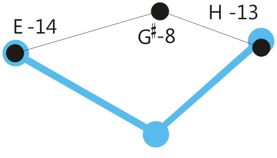 Hier ist je ein Dur-und ein Mollakkord dargestellt, alternativ in reiner und in gleichstufig temperierter Stimmung, die Originaltöne und ihre Frequenzverhältnisse schwarz, ihre Differenztöne und ihre Frequenzverhältnisse farbig gezeichnet. Blaue passen zu den Originaltönen, rote dagegen nicht. Bei den temperiert gestimmten Dreiklängen weist der Mollakkord nur einen störenden Differenzton auf, der Durakkord deren zwei. Bei reiner Stimmung ist der Dur-Akkord störungsfrei, der Mollakkord weist dagegen immer noch einen störenden Differenzton auf.