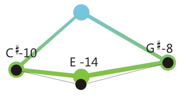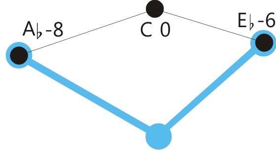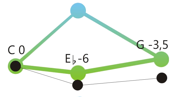 Links aus denselben Terzen wie beim rein gestimmten Dur-Akkord gebildet, rechts mit alternativen Terzen. Die alternative Version liegt ganz nahe bei der gleichstufigen Stimmung. In den wohltemperierten Stimmungssystemen sind alle Mollakkorde entweder nahe zum einen oder zum anderen Ideal gestimmt. Leider kann man die alternativen Terzen nicht für Dur-Akkorde einsetzen. Diese würden immer noch schräg klingen.